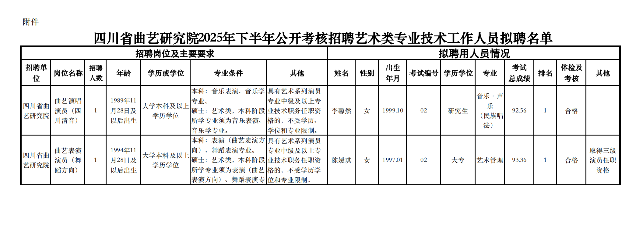 附件:四川省曲艺研究院2025年下半年公开考核招聘艺术类专业技术工作人员拟聘名单